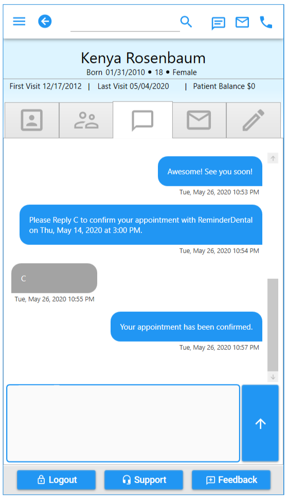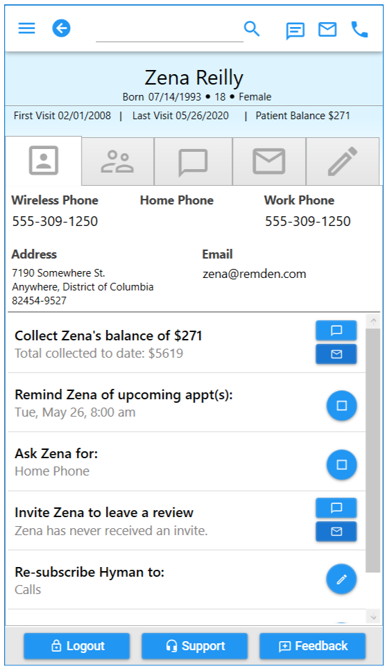 A quick search of Zena in The Popup grabs all of Zena's relevant information and action items from ReminderDental.com.